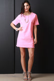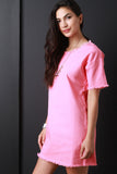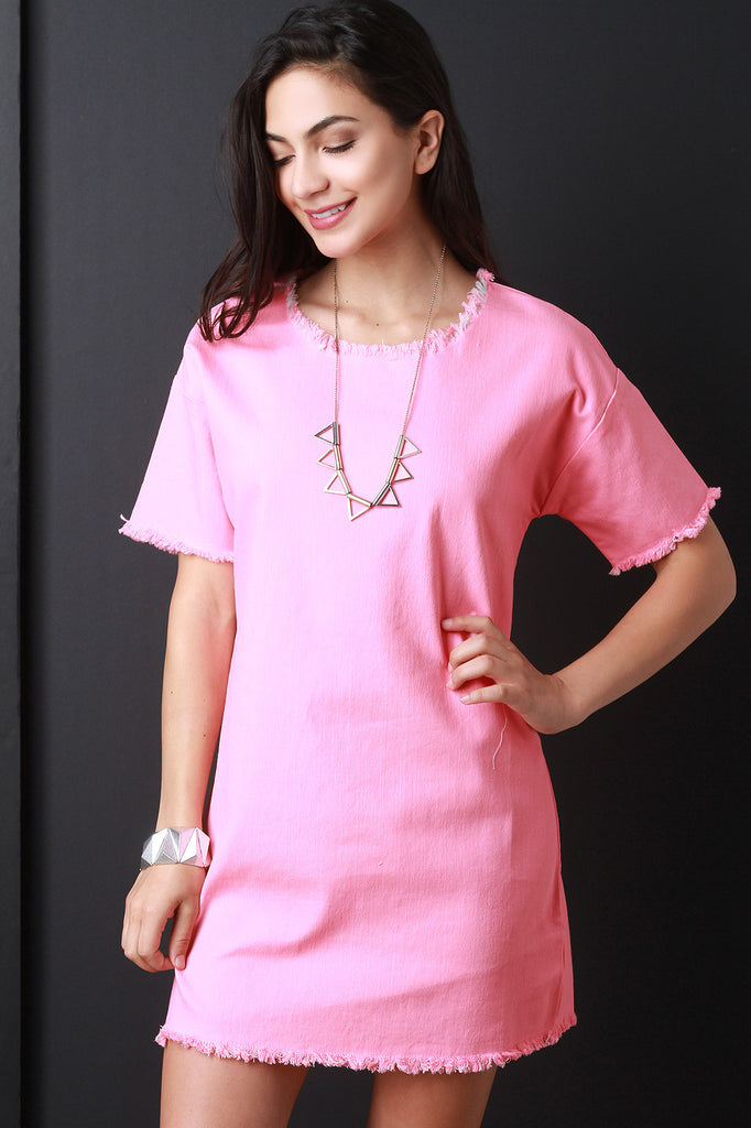 This chambray dress features a round neckline, short sleeves, boxy shift cut fit, and frayed hemlines. Accessories sold separately. Made in U.S.A. 76% Cotton, 22% Polyester, 2% Spandex.