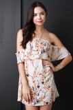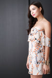 This stylish mini dress features and off the shoulder elastic neckline. ruffle layer woven fabrication, cherry blossom all over print, with a a loose shift dress silhouette. Accessories sold separately. Made in U.S.A. 100% Polyester.