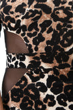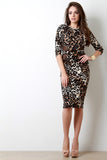 This timeless dress features a thick knit fabrication, leopard print pattern, round neckline, mesh paneling cutouts, and elbow sleeves fit. Finished with padded shoulders, midi-length hemline, and center back slit. Accessories sold separately. Made in U.S.A. 96% Polyester, 4% Spandex.