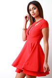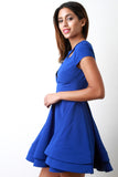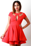 This beautiful dress features a mock neckline with front keyhole details, open back, and cap sleeves construction. Finished with a mini-length layered flare skirt with a banded hemline, two button hook closure at nape, and hidden rear zipper closure.