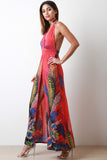 This gorgeous maxi dress features a stretchy smooth knit with fireworks print, deep-v surplice neckline, sleeveless design, and open back construction. Finished with a high-cut slit at front and maxi-length hemline. Accessories sold separately. Made in U.S.A. 65% Polyester, 35% Rayon.