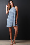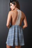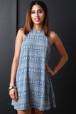 This sleeveless dress features a high round neckline, crochet embroidery racerback, shift cut fit, and pattern print. Accessories sold separately. Made in U.S.A. 100% Polyester.