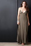 This daring dress features a flowy knit fabrication, halter design, strap at bustier, thin shoulder straps to a crisscross back, and maxi length hemline. Accessories sold separately. 100% Rayon.