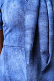 This vintage dress features a smooth stretchy knit fabrication, denim print design, v-neckline with self-tie sash detail, short puffed sleeves, and high-low hemline. Accessories sold separately. Made in U.S.A. 95% Polyester, 5% Spandex.
