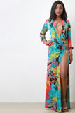 This alluring maxi dress features a smooth stretchy knit fabrication, abstract watercolor prints, surplice v-neckline, and front slit with ruched detail. Finished with a cuffed long sleeves and maxi-length hemline. Accessories sold separately. Made in U.S.A. 95% Polyester, 5% Spandex.