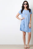 This shift dress features scoop neckline, woven fabrication, marbled dye print, raglan sleeves, double layer with high side slits on top layer, back keyhole with button at nape and a mini length hemline. Accessories sold separately. 100% Rayon.