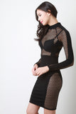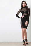 This bodycon dress features a mock neckline, long sleeves, semi-sheer mesh panels throughout, and a zipper fastener at back. Accessories sold separately. 68% Cotton, 27% Polyester, 5% Elastane.