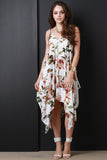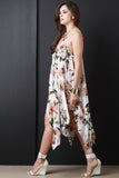 This lovely dress features a floral print fabrication, v neckline, adjustable spaghetti shoulder straps, deep v back, shift silhouette, and handkerchief hemline. Accessories sold separately. 100% Rayon.