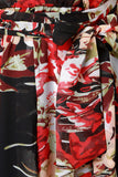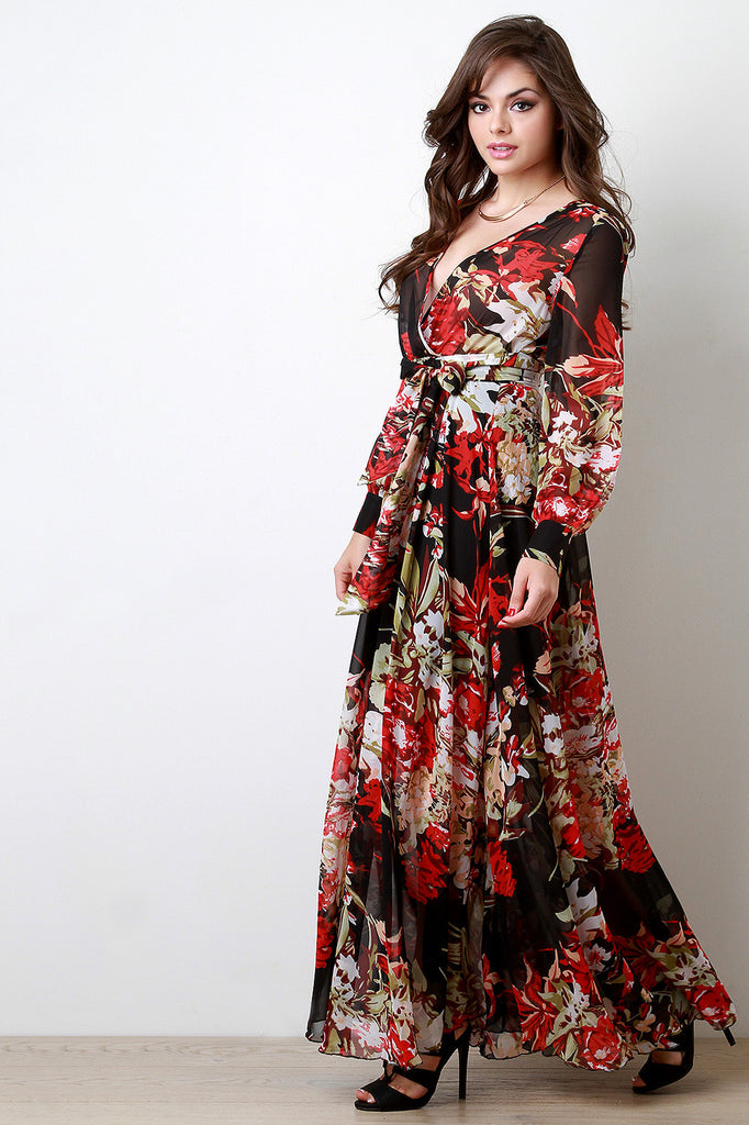This chiffon fabricated maxi dress features a floral print design, surplice wrap neckline, and button-accented cuff longsleeves. Finished with a self-tie waist sash. Accessories sold separately. 100% Polyester.
