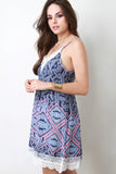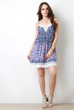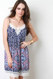 This causal summer dress features adjustable spaghetti straps, a v neckline with crochet trim, gather empire waist, open back, woven fabrication, half lining, and a flare cut hemline with crochet lace trim. Accessories sold separately. 100% Rayon.