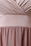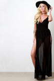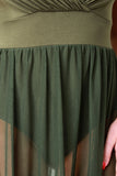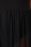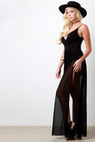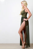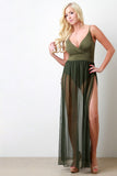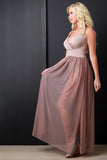 This chic dress features a jersey knit top, surplice v-neckline, thin shoulder straps to a crisscross back, contrasting mesh maxi-length bottom, deep side slits, and brief underlay. Accessories sold separately. Made in U.S.A. 96% Polyester, 4% Spandex.