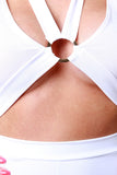 This daring dress features a smooth stretchy knit fabric, caged yoke, strappy construction with front/back metallic ring detail, open midsection, and high-low hemline. Accessories sold separately. Made in U.S.A. 92% Polyester, 8% Spandex.