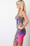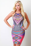 This bodycon dress features a smooth stretchy knit fabrication, geometrical neon print design, halter neckline, and sleeveless construction. Finished with a mini-length hemline. Accessories sold separately. Made in U.S.A. 92% Polyester, 8% Spandex.