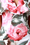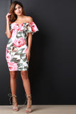 This trendy dress features a textured knit fabrication printed with roses pattern, ruffled off-the-shoulder neckline with a v-wire inset detail, and midi-length hemline. Accessories sold separately. Made in U.S.A. 96% Polyester, 4% Spandex.