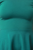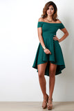 This simply cute skater dress features a soft stretchy knit fabrication, off the shoulder neckline, and ruffled skirt finished with high-low hemline. Accessories sold separately. Made in U.S.A. 65% Rayon, 30% Nylon, 5% Spandex.