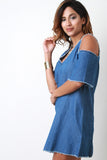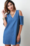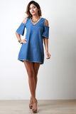This casual dress features a thin denim fabrication, v neckline, cold shoulder cut outs, tent dress silhouette, back triangle cut out, with frayed fringe hems. Accessories sold separately. 100% Cotton.