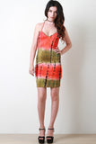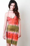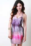 This jersey knit mini dress features tie dye print on jersey knit fabrication, v-neckline, spaghetti shoulder straps, and a crisscross back. Accessories sold separately. Made in U.S.A. 96% Rayon, 4% Spandex.