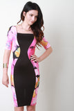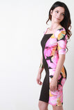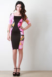 This chic midi dress features a square neckline, half sleeves, knit fabrication, large bold floral print pattern, with a contrast hourglass center front and back, invisible zipper closure, midi length hem with a back slit. Accessories sold separately. 95% Polyester, 5% Spandex.