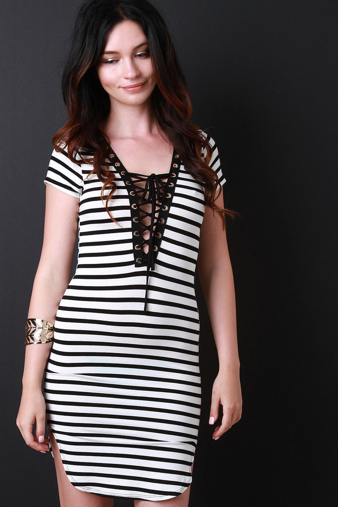 This casual dress features a soft knit fabrication, stripe pattern, cap sleeves, a deep v lace up neckline, eyelet trim, curve hugging bodycon fit with a rounded mini length hemline. Accessories sold separately. 95% Rayon, 5% Spandex.