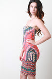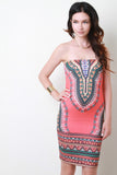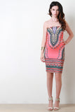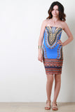 This bodycon dress features smooth stretch fabric, dashiki print, strapless construction, and midi length. Accessories sold separately. Made in USA. 92% Polyester, 8% Spandex.