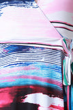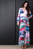 This maxi dress features a surplice top, long puff hem sleeves, knit fabrication, colorful abstract print and a flowy wrap style maxi skirt. Accessories sold separately. Made in U.S.A. 95% Polyester, 5% Spandex.