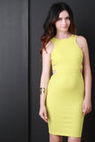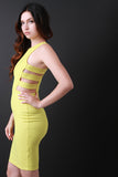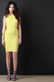 This sexy dress features a textured knit fabrication, high rounded neckline, sleeveless design, open side cage detail, exposed metal zipper closure with a back keyhole and single button closure at nape, finished with a bodycon fit and midi length hemline.