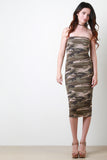 This bodycon dress features jersey knit, camouflage print, strapless construction, and midi length. Finished with lining. Accessories sold separately. Made in USA. Self: 95% Rayon, 5% Spandex. Lining: 95% Rayon, 5% Spandex.