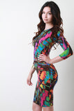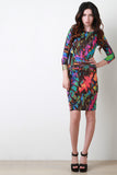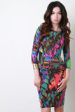 This midi dress features smooth stretch fabric, colorful abstract print, and long sleeves. Accessories sold separately. Made in USA. 92% Polyester, 8% Spandex.