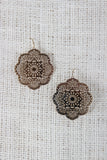 These delicate dangle earrings features a mandala shape with laser cut filigree designs in the center, high polished finish and french hook backs.