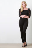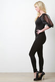 This sleek jumpsuit features semi-sheer bishop sleeves, scoop boat neckline, sculpture fit, taper cut legs, and zipper fastener at back. Accessories sold separately. Made in U.S.A. 95% Rayon, 5% Spandex.