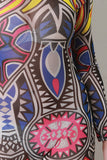 This tribal print throughout, semi-sheer mesh fabrication, round neckline, back keyhole cutout design with button closure at nape, and long sleeve construction. Finished with taper cut legs. Accessories sold separately. Made in U.S.A. 100% Polyester.