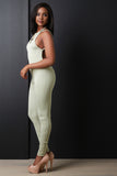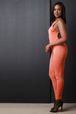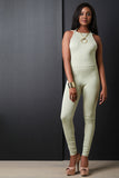 This chic jumpsuit features a backless design, high neckline, shoulder and neck spaghetti straps, knit fabrication, finished with a taper cut leg. Accessories sold separately. Made in U.S.A. 95% Polyester, 5% Spandex.