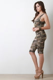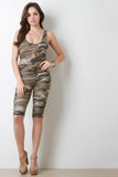 This jersey knit jumpsuit features a camouflage print design, round neckline, scoop back, sleeveless, stretch fit, and knee length shorts. Accessories sold separately. Made in U.S.A. 96% Rayon, 4% Spandex.