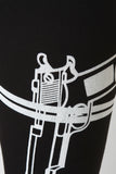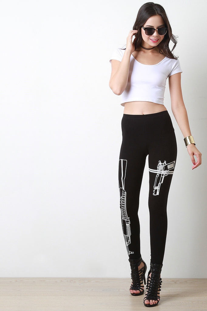 These edgy leggings feature stretch jersey knit, elasticized waist, gun graphics, and taper cut. Accessories sold separately. 95% Cotton, 5% Lycra.