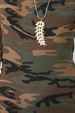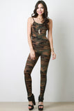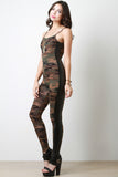 This fitted sleeveless jumpsuit features a soft jersey knit with camouflage prints, vegan leather side panels, spaghetti shoulder straps, scoop back, and taper cut legs. Accessories sold separately. Made in U.S.A. Self: 95% Cotton, 5% Spandex. Contrast: 95% Polyester, 5% Spandex.