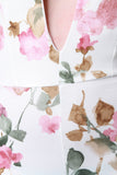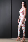 This jumpsuit features a deep v neckline, knit fabrication, watercolor style floral print, cross strap detail, spaghetti straps, tapper cut legs and an exposed metal zipper closure. Accessories sold separately.