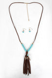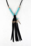 This vegan suede tassel necklace features a wooden beads, metallic beads, gold-tone feather detail, and adjustable lobster hook closure. Earrings feature a drop chains with beads detail and french hook back.