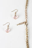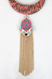 This statement necklace features a flat curb link chain main, woven chevron plate piece, and mixed acrylic gems pendant with chain tassel. Lead and nickel free.