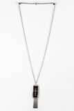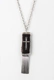 A long necklace with a pebbled vegan leather pendant, cross design attached at the front, and long metallic bar fringe. The cable chain has a lobster hook closure. Lead and nickel compliant.