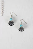 This ethnic inspired statement necklace features a multi strand design, faux turquoise beads, decorative cylinder caps, flattened curb link chain, and etched open sphere beads. Comes with matching earrings.