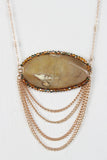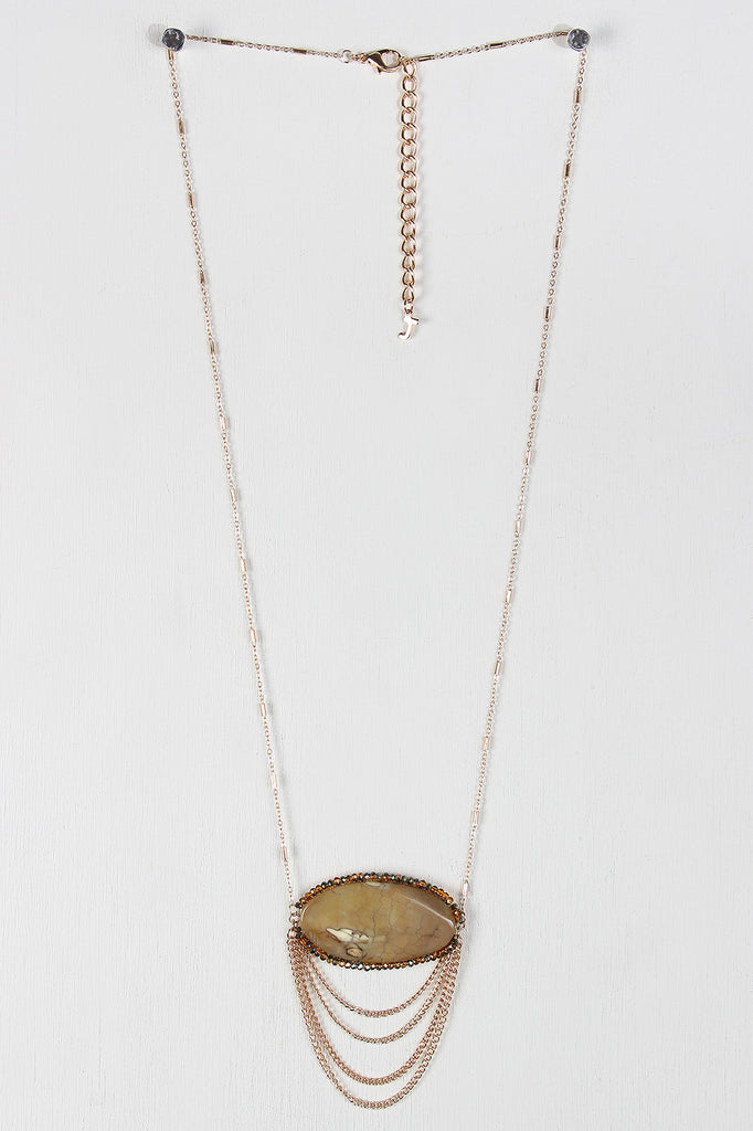 This necklace set features a stone pendant bordered with small crystal beads, draped chain detail, with a cable link chain with spaced crimp bead details, an adjustable lobster claw closure and matching earrings.