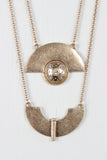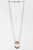 This double layer necklace features open link chain, and two semi circle pendants that fit together, the two necklaces can be worn together or separately, lobster claw closures and comes with matching chain earrings