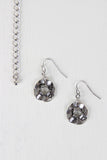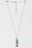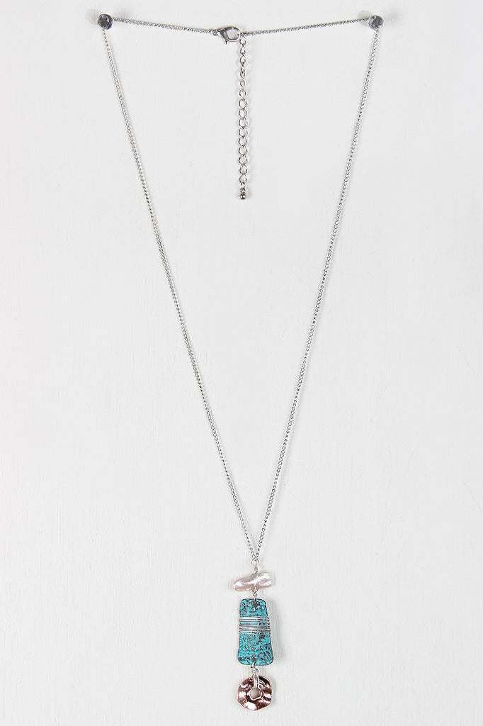 This pendant necklace features a thin curb link chain, three piece pendant with a faux raw pearl, oxidized copper piece and a warped copper circle, with an adjustable lobster claw closure and matching earrings.