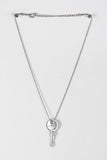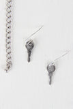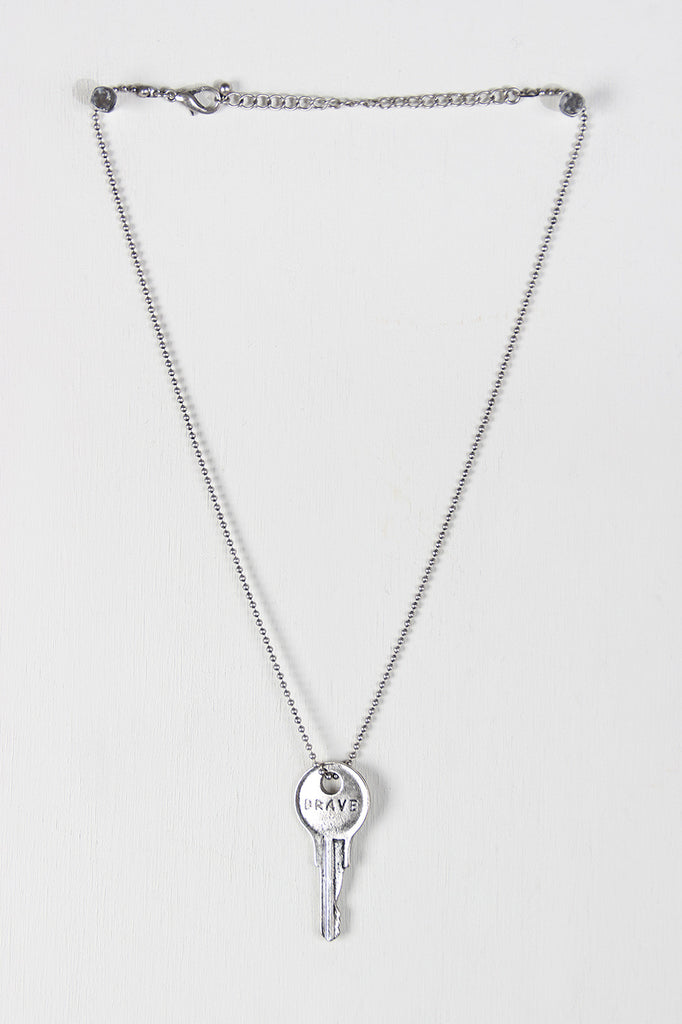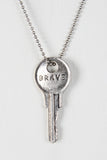 This necklace set features a key pendant with the word "brave" stamped onto it, a ball chain with adjustable lobster claw closure, and matching tiny dangle key earrings.