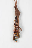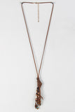This necklace features a vegan leather cord, with a tassel charm pendant containing a mixture of string, cord , chain and various beads. Finished with an adjustable lobster claw closure.