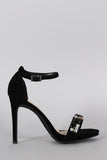 This gorgeous heel features a single toe strap with dazzling jeweled accent, open toe silhouette, and stiletto heel. Finished with lightly padded insole and adjustable ankle strap with buckle fastening.