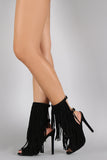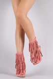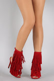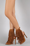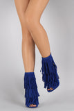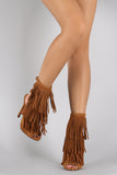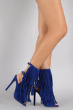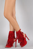 These boho-chic heel feature a peep toe silhouette, triple layered real leather fringe detailing, back cutout design with buckle strap closure, wrapped stiletto heel, and lightly padded insole for comfort.