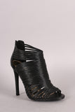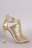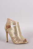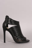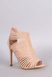 This stunning stripe print or solid vegan leather throughout, peep toe silhouette, strappy caged design, and wrapped stiletto heel. Finished with lightly padded insole and convenient back zip closure.