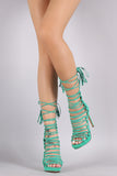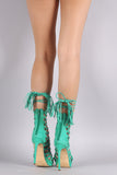 This edgy open toe heel features a tassel lace up front, covered tribute platform, and wrapped stiletto heel. Finished with lightly padded insole and convenient back zip closure.