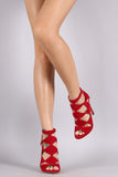 This stunning heel features a soft vegan suede upper with unique cutout design, peep toe silhouette, and wrapped stiletto heel. Finished with lightly padded insole and convenient back-zip closure.